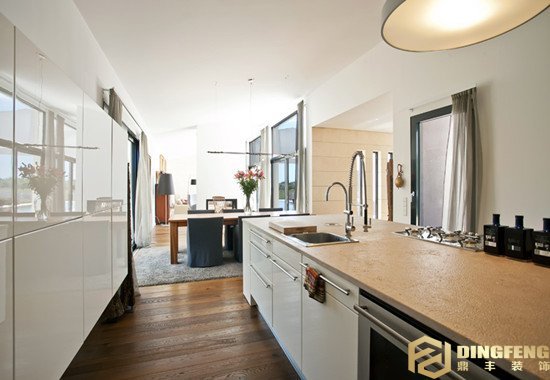 將廚房做成開敞式空間,和早餐臺、吧臺結合在一起,增加了實用性,減少了空間浪費,使小戶型的住宅也具有完備的實用功能,“I”字形的廚房布局,是指所有的工作區沿一面墻一字形布置,給人簡潔明快的感覺。這是在走廊不夠寬、不能容納平行式設計的情況下經常采用的方法。